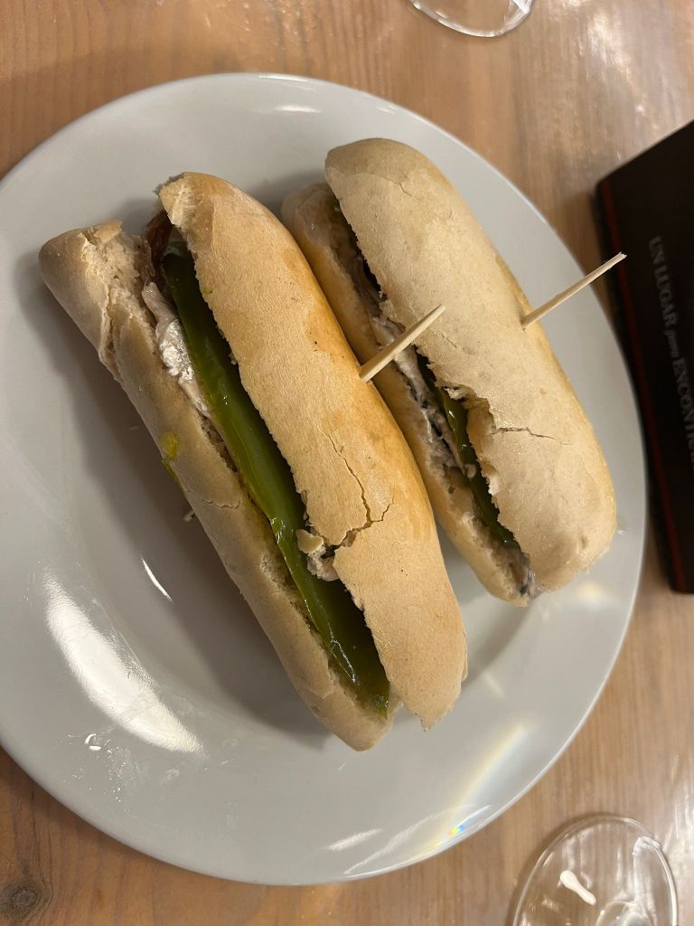 El mítico matrimonio es un montadito de anchoa, boquerón y pimiento verde entre pan y pan, está riquísimo. Para mi de los mejores pintxos de la calle Laurel.