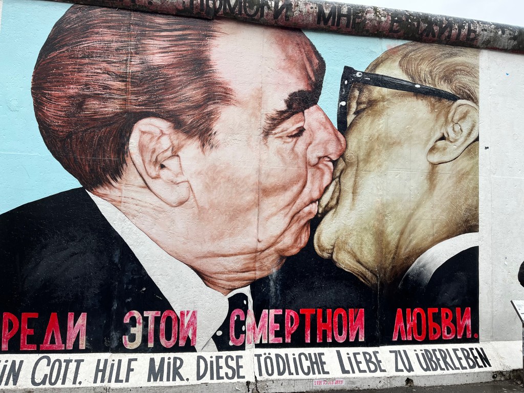 El mural más famoso es el beso entre el líder de la antigua URSS Leonid Brezhnev y el jefe de estado de la RDA Enrich Honecker que pasó en 1979 como motivo de la celebración del 30 aniversario de la creación de la RDA.
